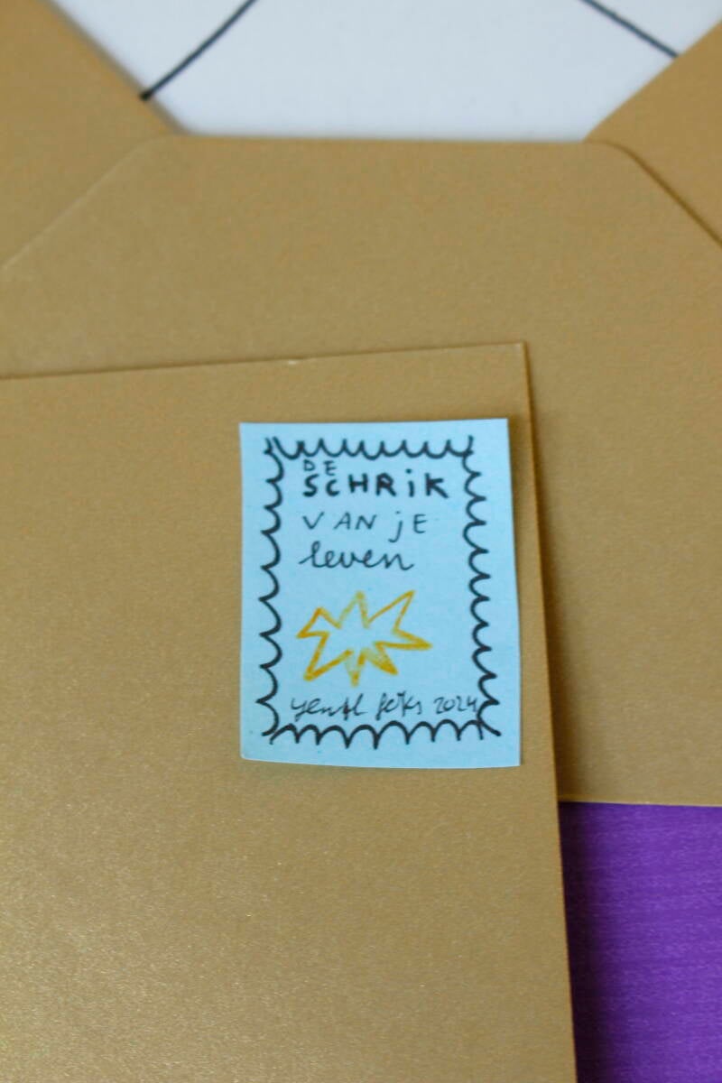 At Schrikkelfestival (Enschede, 2024) you could sit opposite me and tell me the fright of your life. I scribbled something on a piece of paper in a few minutes and gave you a golden envelope filled with jollity to take home - to be opened at the moment of fear. Many could not wait.