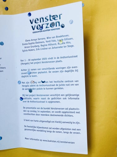 Een van mijn gedichten had in de maand september een logeeradres op een raam van een huis in een straat van een stad in een land op de wereld!