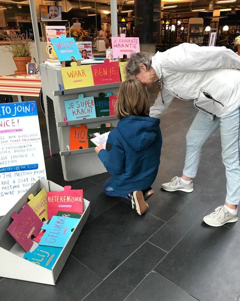 Pop-up vloeractie tijdens de Week van de Verbinding in de Bibliotheek Hengelo konden er middels tickets 'ontmoetingen gepuzzeld' worden. Co-lab met Livia Kubistova.