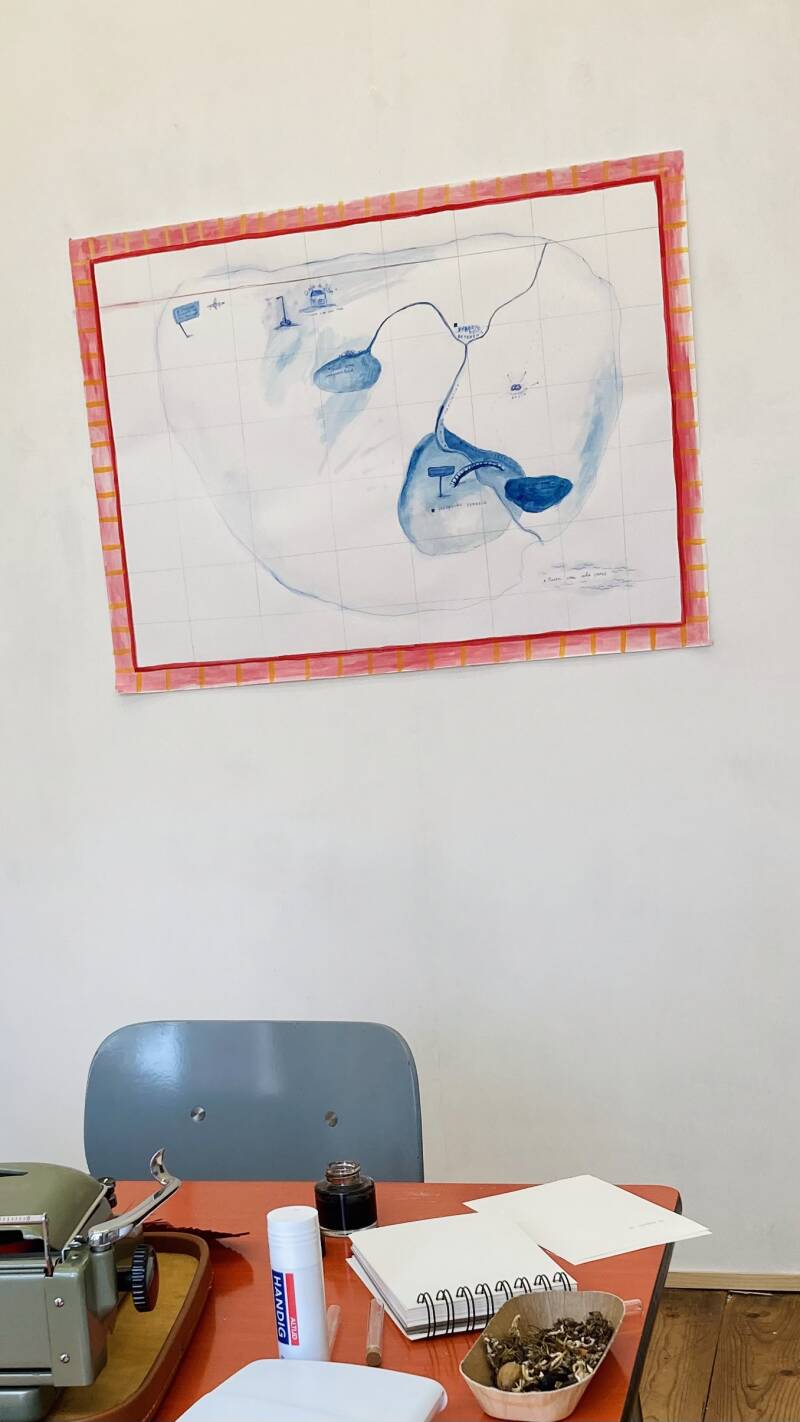 Ondertussen werkte ik aan een landkaart, waarin ik spelend met beeld en taal, verbanden trok tussen al die verschillende soorten (on)zin, en dit in kaart probeerde te brengen. Daarnaast maakte ik gedichten en tekeningen met typmachine en kroontjespen. Ieder gedicht zijnde een uitgefilterde reflectie van een gesprek dat had plaatsgevonden.