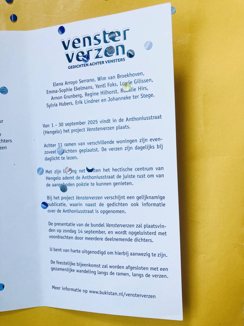 Vensterverzen was een participatie project van de Ambassade van BukistanAchter 11 ramen van verschillende woningen aan de Anthoniusstraat in Hengelo waren eveneens zoveel gedichten geplaatst. "Venstergevers" en dichters ontmoetten elkaar tijdens een georganiseerde lunch, waar de poëzie van het leven gevierd werd.